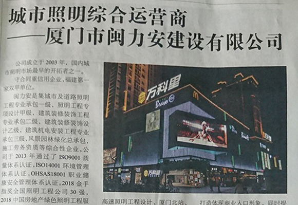 廈門市閩力安建設(shè)有限公司成立于2003年,公司取得市政公用工程施工總承包貳級、建筑裝修裝飾工程專業(yè)承包壹級、城市及道路照明工程專業(yè)承包壹級、電子與智能化工程專業(yè)承包貳級、消防設(shè)施工程專業(yè)承包貳級、電力工程施工總承包叁級、建筑機電安裝工程專業(yè)承包叁級、輸變電工程專業(yè)承包叁級、環(huán)保工程專業(yè)承包叁級、照明工程設(shè)計專項甲級、建筑裝飾工程設(shè)計乙級、施工勞務(wù)等資質(zhì)的綜合型企業(yè),公司于2013年通過了ISO9001質(zhì)量體系認證,ISO14001環(huán)境管理體系認證,OHSAS18001職業(yè)健康安全管理體系認證。
